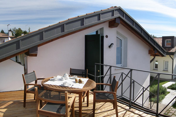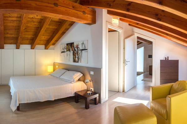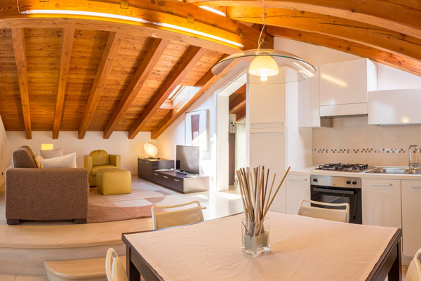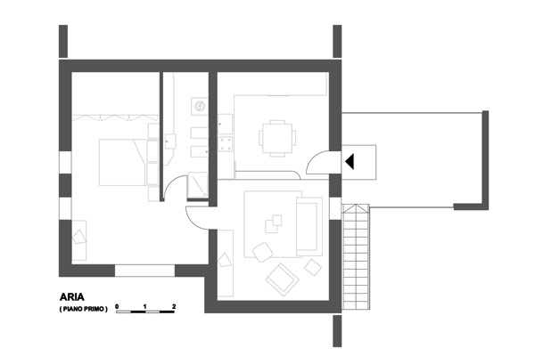 L'appartamento Aria è interamente mansardato con travature in larice a vista e composto da cucina - soggiorno, camera matrimoniale e bagno. Situato al primo piano, è completo di tutti gli arredi ed elettrodomestici compreso impianto di climatizzazione. Inoltre possiede un'ampia terrazza ad uso esclusivo dei clienti. Ideale per brevi periodi.